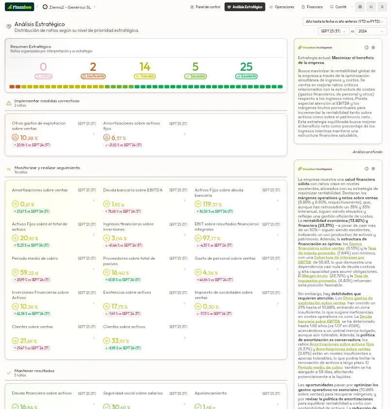 Cada ratio se clasifica automáticamente según el nivel de atención que requiere en función de tu estrategia financiera (Garantizar Liquidez, Maximizar Beneficio o Reducir Deuda). Los indicadores más críticos aparecen primero para que actúes donde realmente importa.
